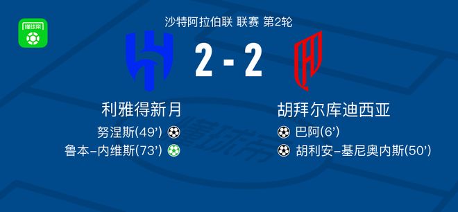 9月14日,在沙特阿拉伯联盟的第二轮比赛中,里亚德新月在家中面对了Hubairkusia。比赛开始后,Hubairkusia首次在BAA得分。然后,马尔科姆(Malcolm)向里亚德(Riad)新月提供了援助,纳恩斯(Nunes)设法将球与得分匹配。下半年,Jubairkoticia在Nández的支持下返回领先。在比赛的晚些时候,鲁本·内维斯(Ruben Neves)得分Riad Crescent,得分恢复了同一起跑线。最后,两者都震惊了2-2,以建立和平。在六分钟的美好时刻,Hubairkusia Baa球员攻入了进球。在第49分钟,Riad Criad Crescent Malcolm球员帮助Nunes攻入了进球。在第50分钟,Retairkudicia球员Nandes帮助朱利安·吉尼翁(Julian Ginions)得分。在第73分钟,Riad New Moon Ruben Neves获得了点球。设备对齐的技术统计数据