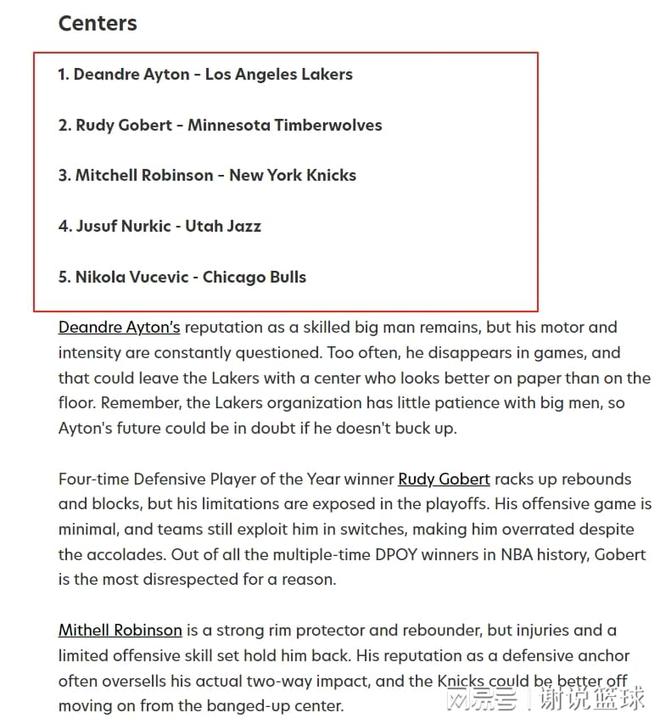乔尔·恩比德(Joel Embiid)受了重伤,因此在联盟中心的球员中,乔基奇(Jokic)和城市只能被视为球队的核心。此外,每个人都非常可耻。他们与工具的纸相提并论,他们的比赛风格相对蓝色,只能清洁后方,并为他们的队友外面的婚礼服。因此,在当今的联盟中,当地媒体目前对五个高估中心有自己的看法。其中包括艾顿(Ayton)第一名的湖人队(Lakers)选择名单,戈特伯特(Gortbert),努尔基奇(Nurkic)和维斯维奇(Vsevic)的球员中有三名欧洲球员。艾顿(Ayton)是2018年的最佳选择。它可以包含唐西奇(Doncic),带来年轻和亚历山大(Alexander),而且他的才华无疑是毫无疑问的。但是,艾顿在法庭上养成了许多不良习惯,因此每次他进入冲突点时,他的动作都会变形和分心。艾顿(Ayton)今年夏天被收购为开拓者。湖人找到了讨价还价n对汤夫(Naobao),但他们只能说他们对艾顿(Ayton)谨慎和乐观。作为合格的发起人,没有重要的问题,但是期望艾顿成为内部导师似乎太乐观了。 Gobert的蓝色脖子属性已满,并四次获得了最佳防守球员的奖项。它还可以对篮板和运输块进行良好的保护。但是,当戈伯特经常在季后赛阶段被军事训练任命时,如果森林狼将加入爵士乐,这已经得到了几次证明。戈伯特不断被所有班级的名人嘲笑也就不足为奇了。米切尔·罗宾逊(Mitchell Robinson)处于类似情况。恢复和防守也很好,但是米切尔·罗宾逊(Mitchell Robinson)并不像戈特伯特(Goatbert)那样好。相反,米切尔·罗宾逊(Mitchell Robinson)非常脆弱。自从他进入联盟以来,他就遭受了痛苦,现在正在取代尼克斯。实际上,在高峰时段,Nurkic被认为是超出水平的中心。他的步骤和机动性遭受了损失,但Nurkic仍然对他坚实的基本技能和合格技能保持可靠。但是,由于近年来受伤的积累,NURKIC的形态越来越恶化。他已经去了黄蜂队打糟糕的球队。如果您甚至无法显示数据,则可能会在NBA失去工作。 Vucevic曾经被选为全明星,但英雄当时没有提及他的勇气。如今,Vucevic不仅在防守方面可靠,而且进攻稳定性也大大降低。结合其高薪,VSEVIC现在已成为负面的资产,公牛很难教他。